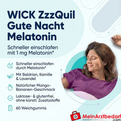 Lieferumfang: 60 Stk. WICK ZzzQuil Gute Nacht Melatonin 1 mg, Weichgummis (Mango‑Banane) – Hersteller: WICK